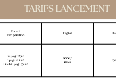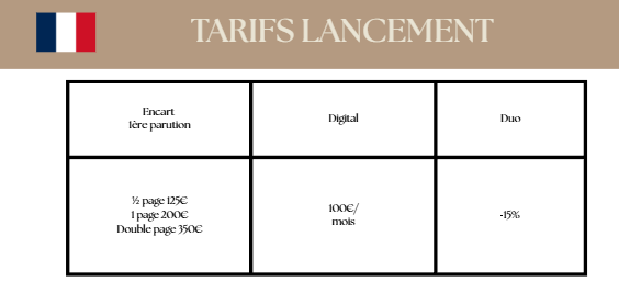 Il est important de noter que les tarifs peuvent évoluer avec les prochaines éditions en fonction du nombre de distributions. Nous vous encourageons donc à profiter de cette première édition pour établir une relation durable avec notre magazine.