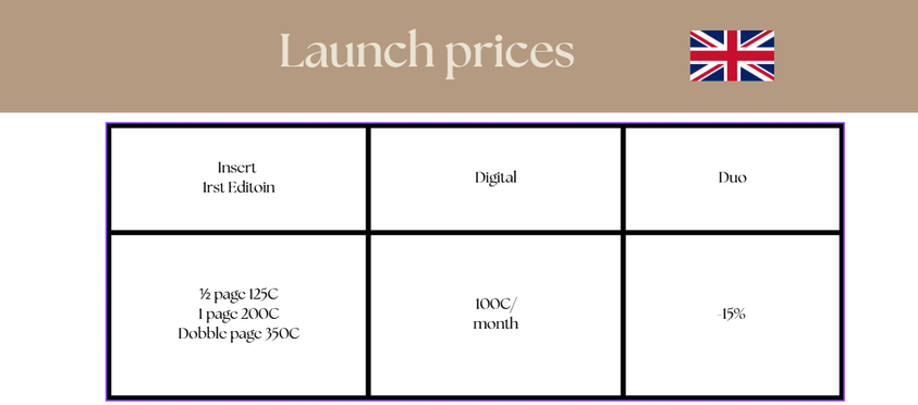 Please note that prices may change in future editions depending on the scale of distribution. We therefore encourage you to take advantage of this first edition to build a long-term partnership with our magazine.